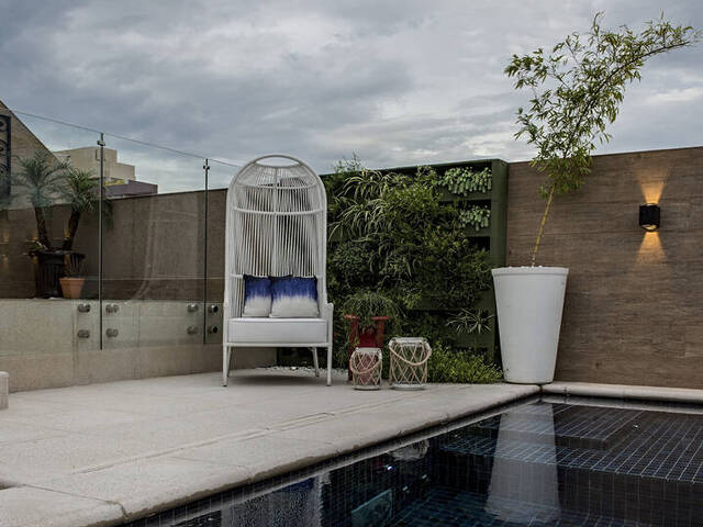 No andar superior, um dos grandes destaques é o terraço com piscina, que oferece uma vista lateral parcial da praia, ideal para momentos de lazer e relaxamento.